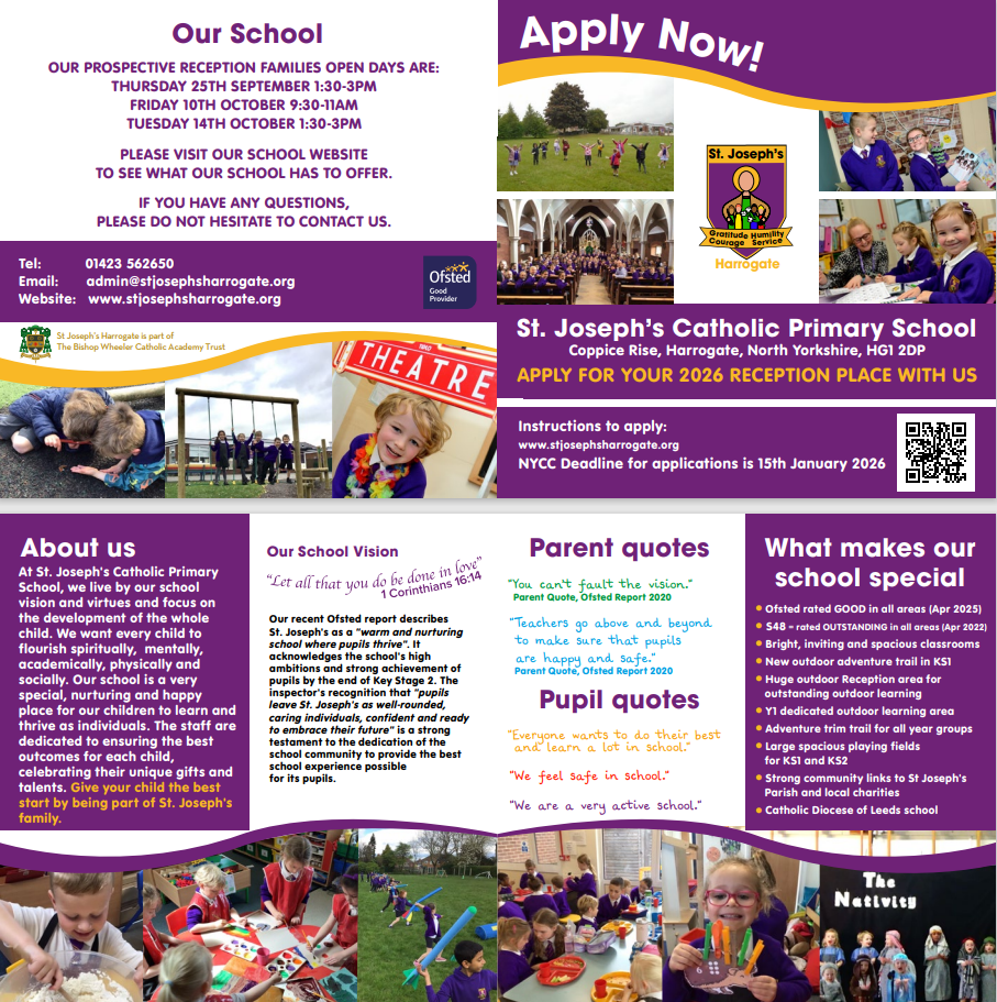 If you would like to book a tour of the school, please contact the school on 01423 562650 or admin@stjosephsharrogate.org